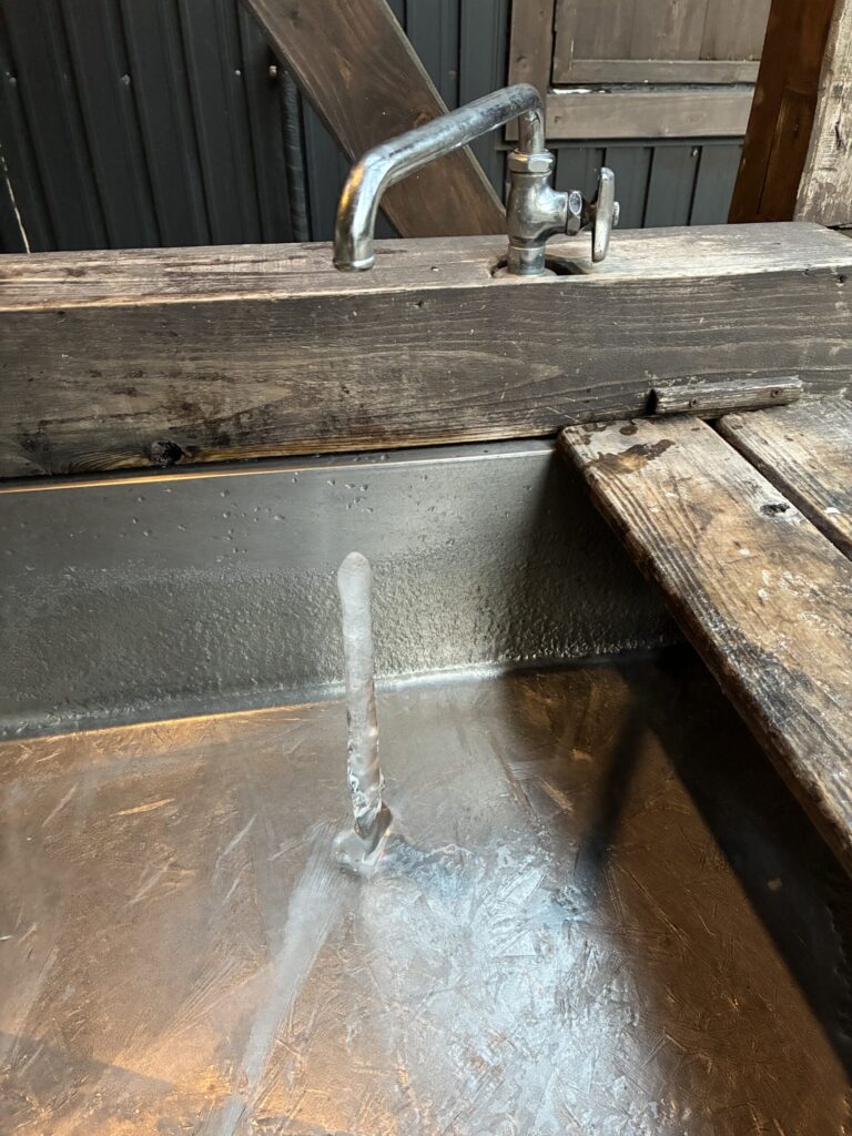 氷柱 2月 1, 2026 最終更新日時 : 2月 3, 2026 社長 初めて見る氷柱 蛇口から落ちる水が徐々に氷を作り上げ最後に氷柱へ 自然のすごさに驚きですね 塵も積もれば山となります 積み重ねの大切さがわるこの氷柱 感動です